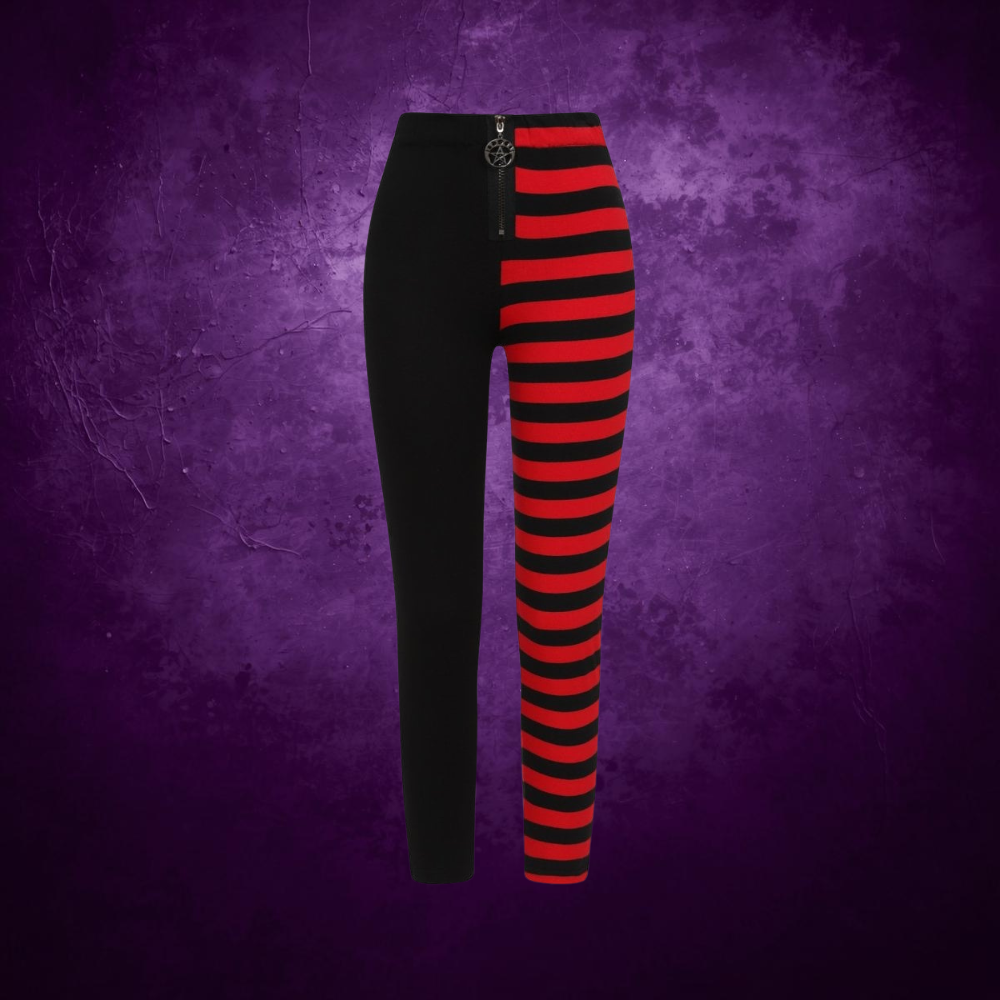 The Half Black Half Stripes Leggings from Banned Apparel are a striking pair of split leg leggings. The alternative leggings feature one black leg and one purple stripes leg, complete with a zip front adorned with a pentagram zip charm. Made from 95% cotton and 5% elastane, these leggings are both comfortable and stylish.